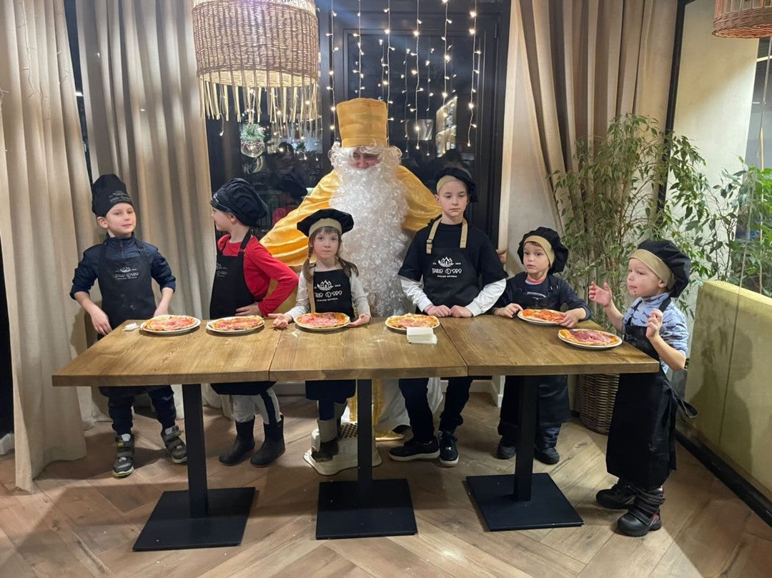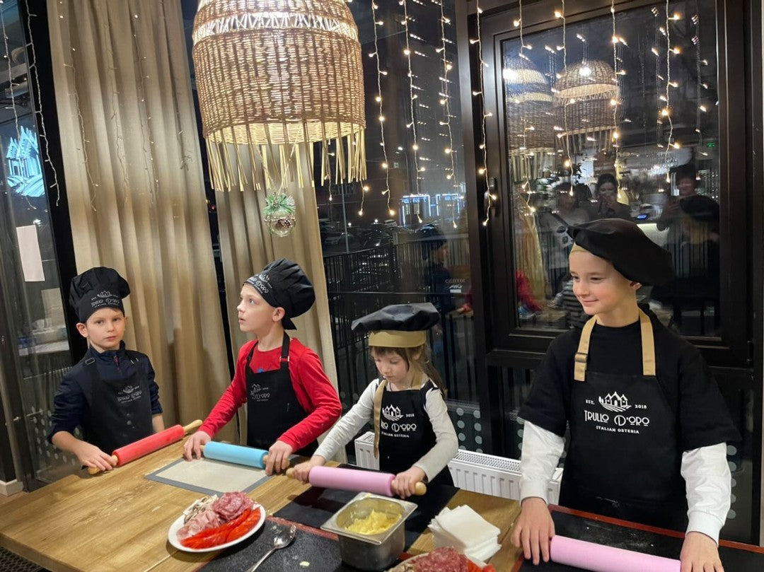Children’s aprons with pockets are often used as uniforms for young guests during masterclasses, cooking shows, or interactive sessions. Personalization options include the child’s name with the logo of the venue.